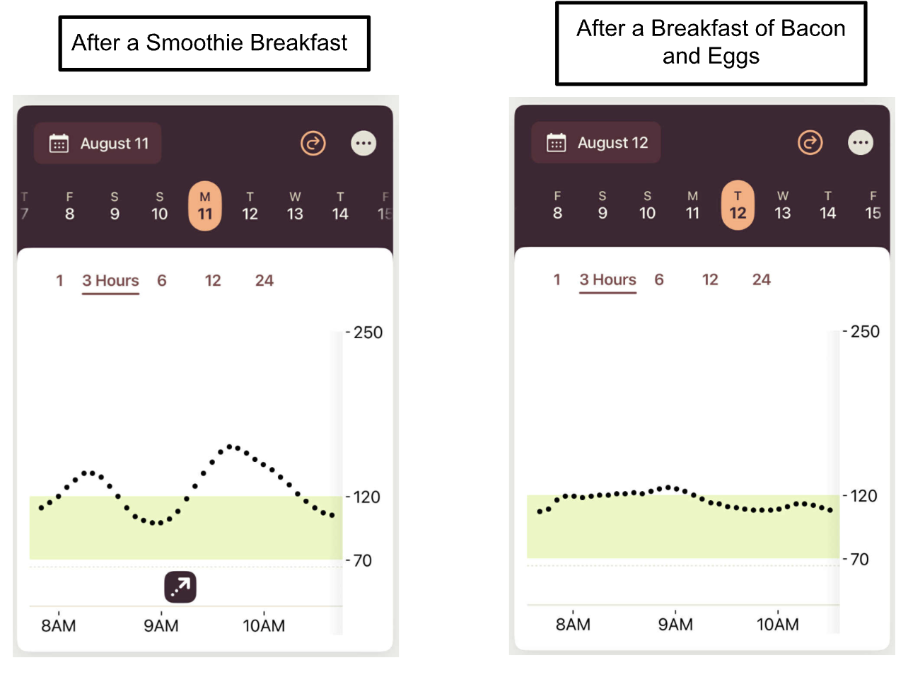 For example, you might notice that a morning smoothie with fruit causes a large spike, while a protein-rich breakfast of bacon and eggs keeps levels steady.