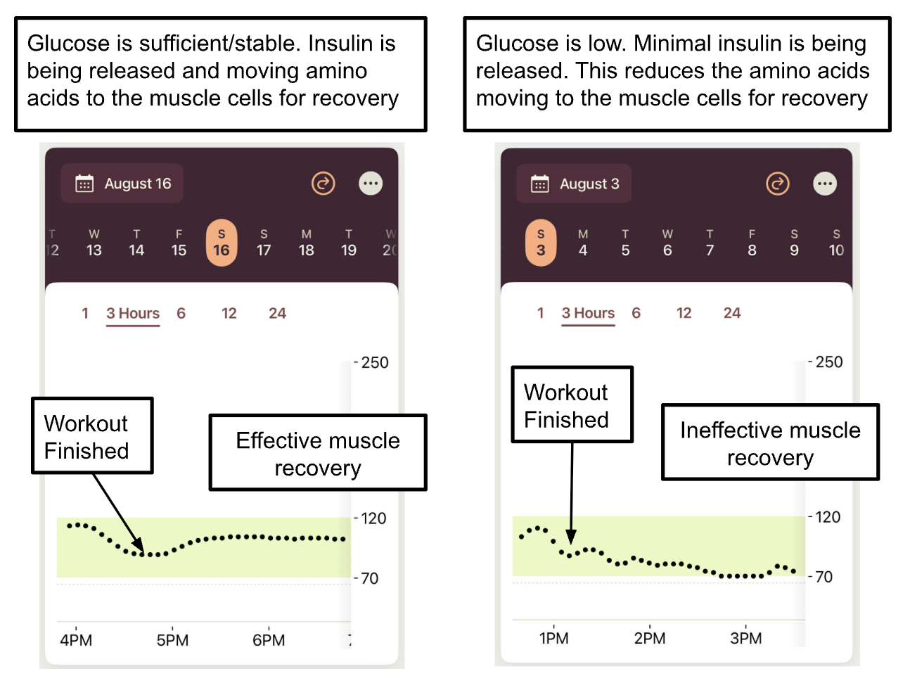 Ideally, you want your glucose levels elevated (but not spiking) after a workout. This is because higher glucose levels means insulin will be released, which helps move amino acids into muscle cells and supports protein synthesis. This helps muscles repair and grow efficiently.