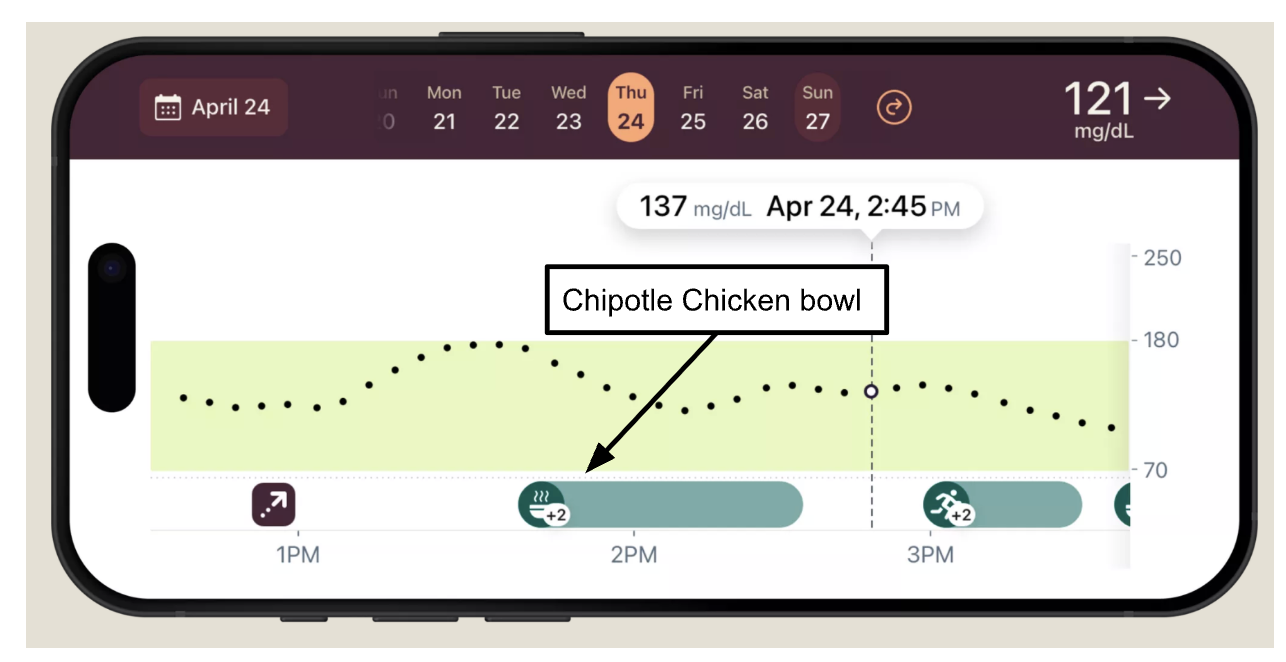 For example, if you had a chicken chipotle bowl for lunch, this graph shows that glucose levels remained stable, illustrating that this is a great lunch for you.
