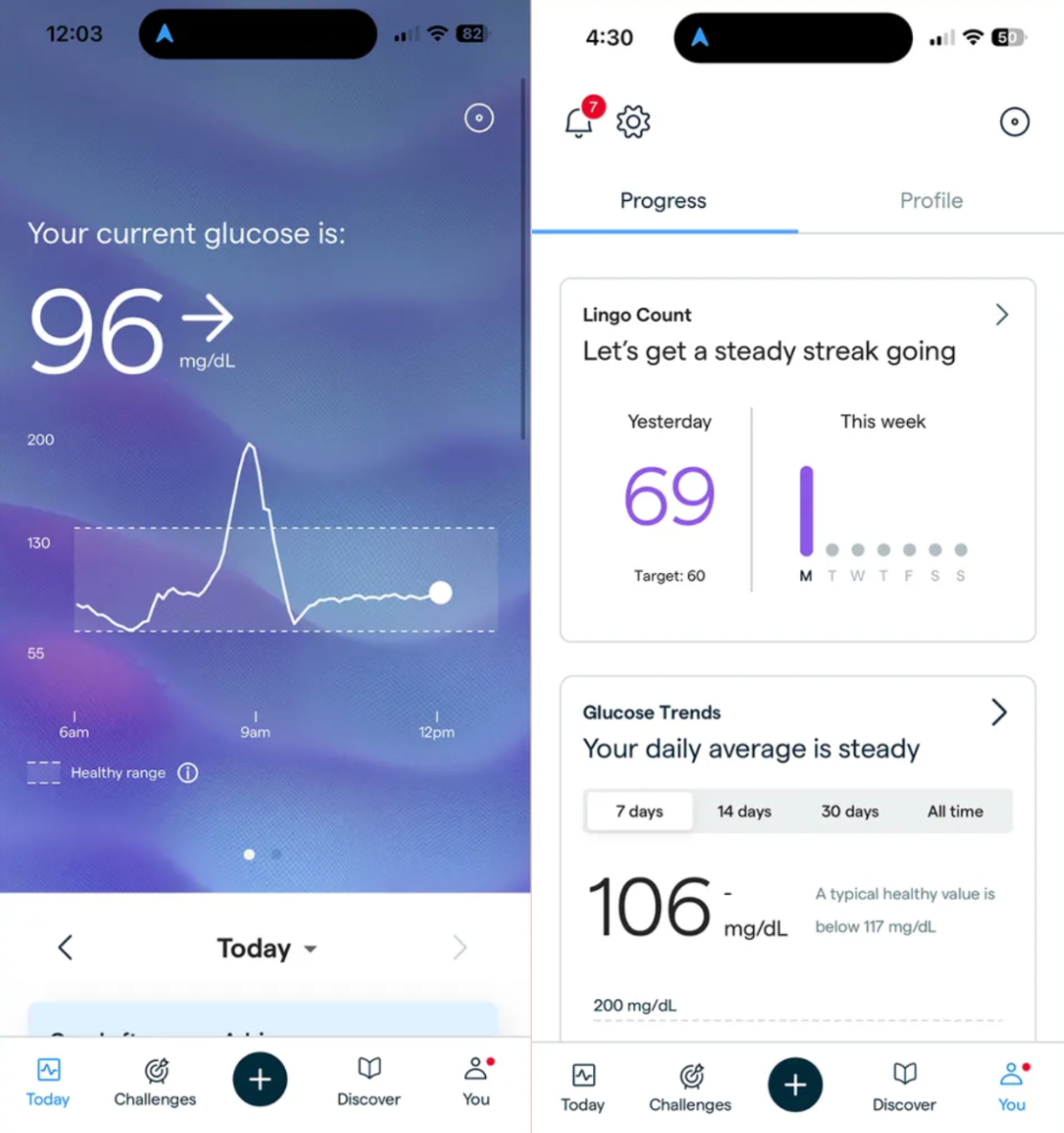 The Abbott Lingo is very similar to the Dexcom Stelo as you can see that it shows your glucose levels over time, allows you to track meals and exercise, and gives you overview reports.