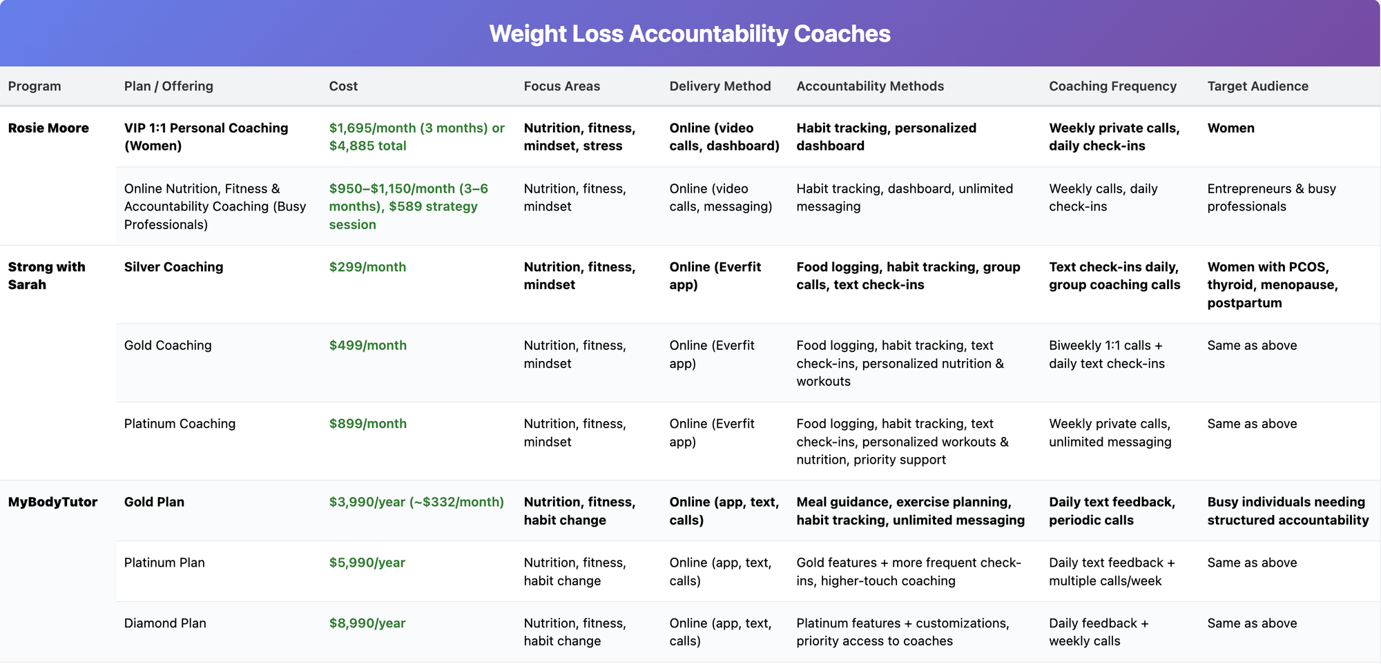 1. Silver CoachingIncludes access to the Everfit coaching app, personalized nutrition guidance, habit tracking, group coaching calls, and text-based accountability check-ins. Pricing: $299/month.