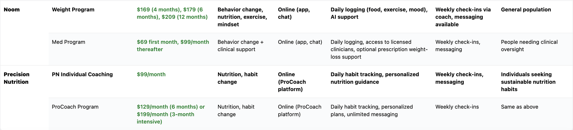 2. ProCoach ProgramA more structured coaching experience including personalized nutrition, habit tracking, and behavior-change strategies. Coaches monitor progress weekly and adjust plans as needed. Includes unlimited messaging support. Pricing: $129/month for a 6-month program, or $199/month for a 3-month intensive program.